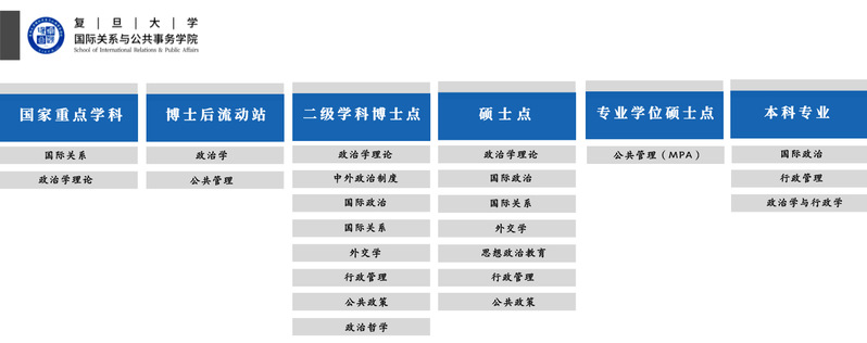 复旦大学国际关系与公共事务学院成立于2000年11月21日。学院前身为1923年建立的复旦大学政治学系。1964年,经中共中央批准成立国际政治系,成为新中国最早设立的三个国际政治系之一;20世纪80年代以后,国际政治、政治学、公共行政学得到快速发展;2000年,国际政治系改组为国际关系与公共事务学院。学院目前拥有政治学(A+)和公共管理(A-)两个国家A类学科,是国家“双一流”学科建设单位,政治学与国际关系在QS世界大学分专业排名中综合实力连续八年(2012-2019)位居世界前50位。