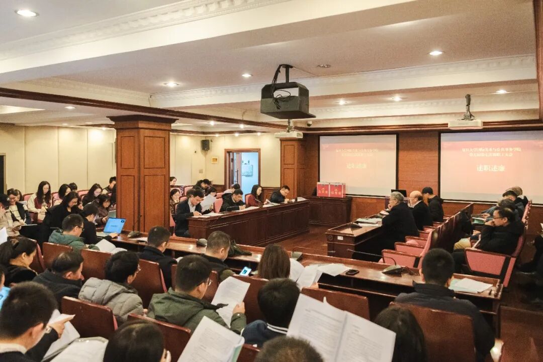 会议第一项议程由学院党政领导向全体教职工进行工作报告和个人述职。党委书记潘伟杰老师围绕2025年度党务工作进行了详细的报告,系统总结了党建与事业深入融合的工作实例,展望了“十五五”规划编制工作。院长苏长和老师围绕学科建设、人才培养、学生、财务、院友工作等作了2025年的工作总结并指出问题,同时提出2026年的工作要点将围绕一流学科治理体系建设、“十五五”规划编制等展开,未来将继续发挥长处、补足短板。接着副书记王英豪老师、副院长张骥老师、副院长张平老师、副院长汪仕凯老师分别就学生工作、教学、外事工作、科研工作等分管领域进行了汇报,使全体教职工全面了解领导班子这一年来所作的工作以及取得的成绩,同时也进一步明确了未来学院工作的重点和努力方向。