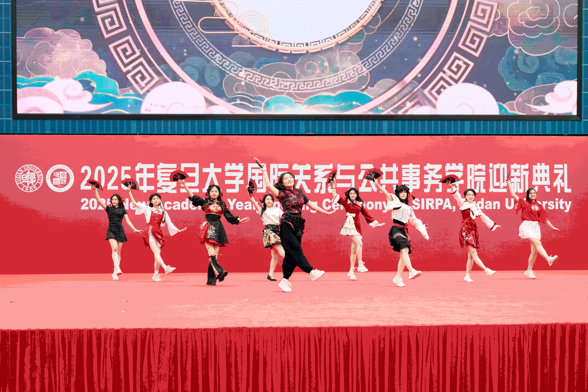 新生代表通过多种形式的才艺表演展现青春风采。舞蹈、武术、歌曲等节目轮番上演。25级与24级本科生带来舞蹈串烧《龙吟寄月·直上云霄》,巧妙融合国风韵律与现代舞步,展现中外文化的碰撞与交融;25级中文项目研究生呈现《武动山河,诗舞致新》,将传统武术、古典舞蹈与深情朗诵相结合,刚柔并济,彰显文化自信与创新精神;25级英文项目新生献唱歌曲《Our Fudan, Our Horizon》,以悠扬的旋律和真挚的歌词,表达对复旦生活的憧憬与对广阔未来的向往。MPA新生深情演绎了经典民族团结歌曲《一个妈妈的女儿》,蕴含着中华民族共同体精神和家国情怀。新生表演既传承中华优秀传统文化,又融汇现代艺术与国际元素,充分体现出国务学子全面发展的综合素质与开放包容的精神面貌。