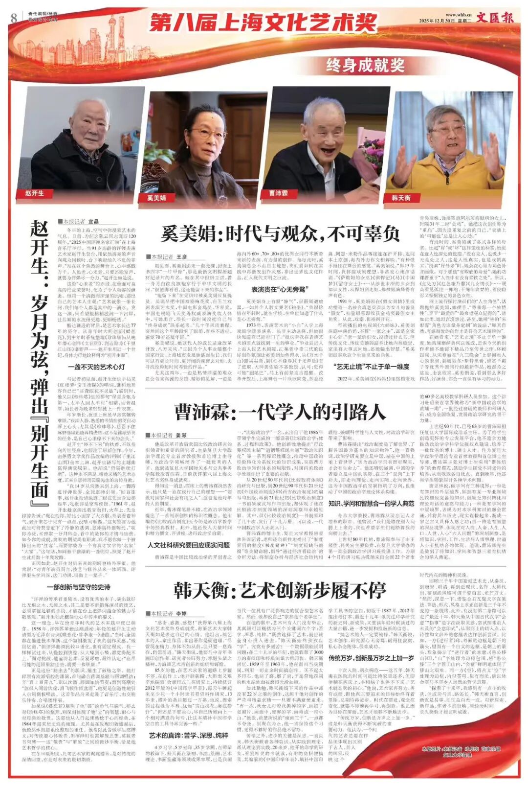 近日,上海市委印发《市委宣传部、市文旅局、市人社局关于评选第八届上海文化艺术奖的通知》(沪委宣〔2025〕283号)。经组织推荐、资格审查、分领域评审、领导小组办公室审核、领导小组审议等环节,第八届上海文化艺术奖名单出炉,我院曹沛霖教授荣获终身成就奖。